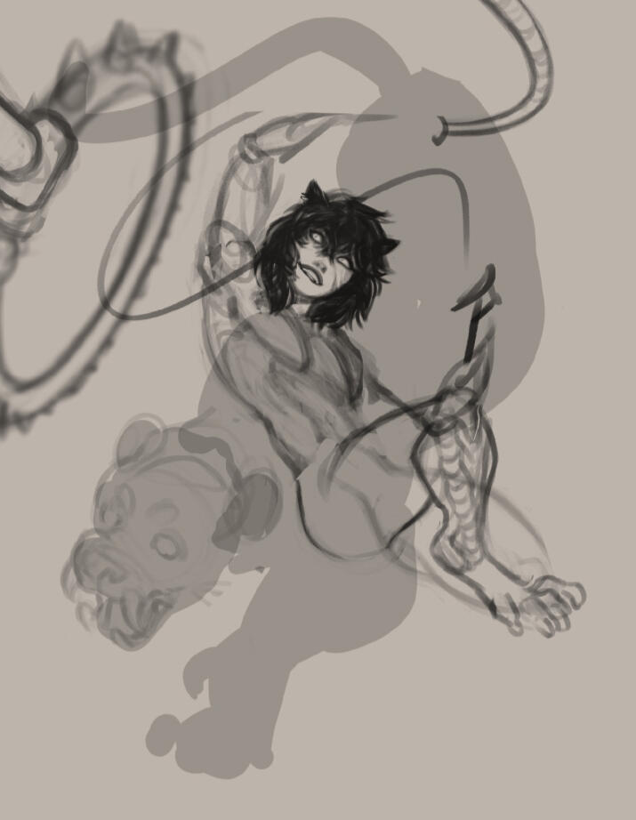 | Tattoos | A large serpentine pattern coils out from his wrist, along his arm, and down his spine until it connects with the base of his tail, A ring of text around his right wrist |
